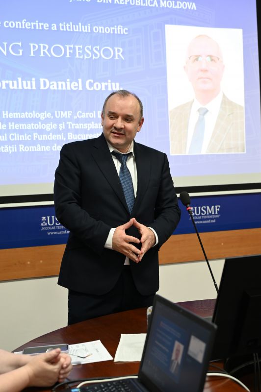 Daniel Coriu a mulțumit pentru încrederea acordată și pentru șansa de a face parte din comunitatea academică a USMF „Nicolae Testemițanu”, accentuând că colaborarea dintre cele două societăți de hematologie are cel puțin 10 ani. „În această perioadă am instruit în spitalul Fundeni colegi mai tineri de la Chișinău, am organizat manifestări științifice comune, am participat în diverse proiecte de cercetare. Noi avem un drum comun și vă asigur că voi depune toate eforturile ca această colaborare să fie una de durată, inclusiv în procesul de integrare europeană pentru care este necesar sprijinul nostru”, a subliniat profesorul român.